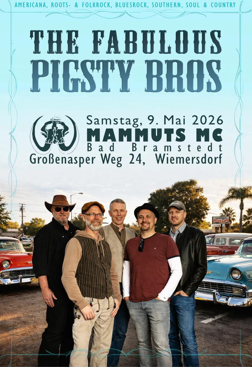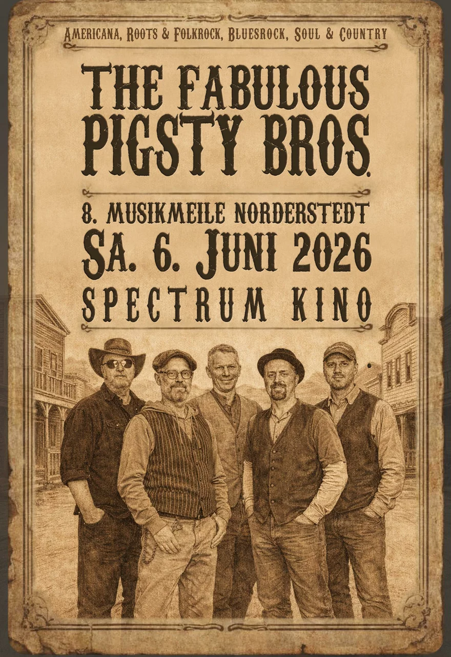 Wir sind noch immer die Pigsty Bros. Die Jungs aus dem Norderstedter Schweinestall, die Americana-Band, die aus purer Lust Rootsrock, Folk- und Bluesrock, Southern, Soul oder auch mal Country mit eigenen Songs mischt und diese Mixture gerne mal unter die Leute bringt.